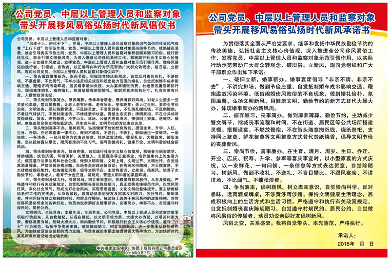 ????倡導移風易俗,樹立良好風尚,是社會發展的需要,也是每個公民的企盼和責無旁貸的義務。2018年9月以來,公司黨委以習近平新時代中國特色社會主義思想和黨的十九大精神為指導,根據漳州市移風易俗工作領導小組要求并結合企業實際,制定并出臺《關于公司黨員、中層以上管理人員和監察對象帶頭開展移風易俗弘揚時代新風的規定》。