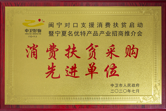 由于在消費(fèi)扶貧工作中表現(xiàn)突出,寧夏中衛(wèi)市政府向公司授予了“消費(fèi)扶貧采購先進(jìn)單位”稱號(hào)。