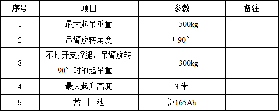 2.1.2整車電動驅動, 吊臂可旋轉;在吊臂根部(吊臂不旋轉)能吊500KG;兩側支撐腿不打開,吊臂旋轉90°,能吊300KG。