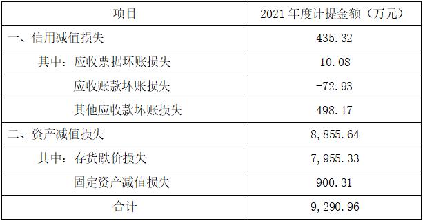 2021年公司確認(rèn)的資產(chǎn)減值損失及信用減值損失總額為9,290.96萬元,相應(yīng)減少當(dāng)年利潤總額9,290.96萬元。本次計(jì)提資產(chǎn)減值準(zhǔn)備符合會計(jì)準(zhǔn)則和相關(guān)政策要求,不存在損害公司和全體股東利益的情形。本次計(jì)提資產(chǎn)減值準(zhǔn)備已經(jīng)年審會計(jì)師事務(wù)所審計(jì)確認(rèn)。