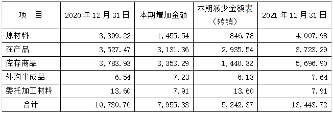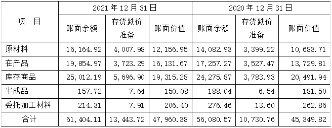 資產(chǎn)負(fù)債表日,公司對各項(xiàng)存貨的成本與可變現(xiàn)凈值比較,存貨成本高于其可變現(xiàn)凈值的,計(jì)提存貨跌價(jià)準(zhǔn)備,計(jì)入當(dāng)期損益。2021年公司存貨分類情況如下表(萬元):