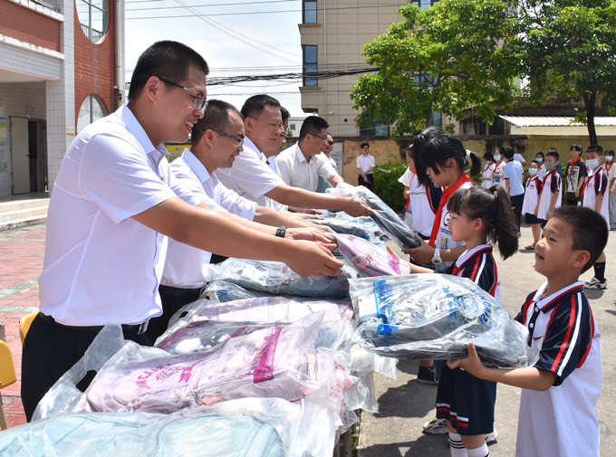 在“助力鄉村振興捐贈儀式”上,劉明福、王志劼代表公司向埭尾村捐贈12萬元,用于埭尾村路燈設施工程建設,為幫助照亮埭美古村旅游之路做出龍軸貢獻。隨后,劉明福一行移步埭尾小學開展歡慶“六一”國際兒童節助學捐贈活動,代表公司向校方捐贈了3萬元改善教學條件資金,為全校181名學生購買了新書包,并給予6名困難學生共6000元助學金。望著孩子們一張張陽光燦爛的笑臉,劉明福一行勉勵孩子們勤奮學習、立志成才,以優異的成績回報家鄉,同時向辛勤耕耘、播灑未來的老師們致以了崇高的敬意。
