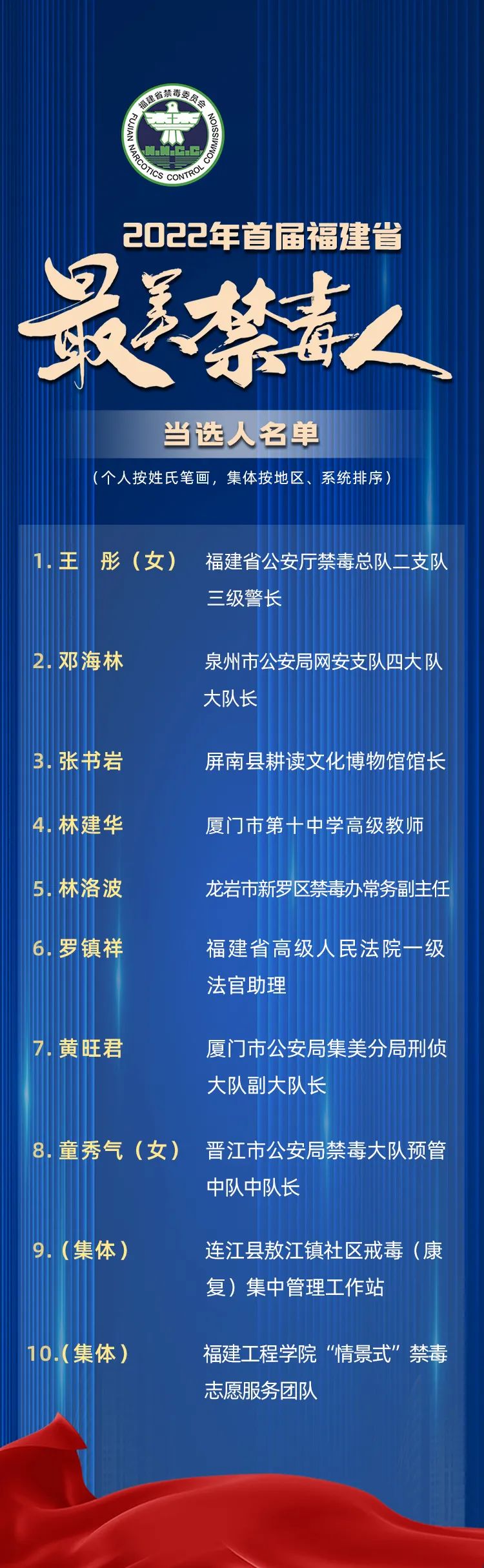 按照《關于組織開展全省首屆“最美禁毒人”宣傳推選活動的通知》要求,經基層推薦、組織初審、網絡投票、專家評審等程序,中共福建省委宣傳部、福建省禁毒委員會辦公室確定了2022年首屆福建省“最美禁毒人”10名當選人、10名提名獎獲得者最終獲評名單。現(xiàn)將名單予以公示,接受監(jiān)督。如有異議,請在公示期限內,通過來信、來電等方式,實名反映情況。