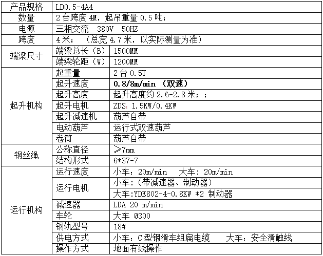 0.5噸單梁橋式起重機,需根據我司現場條件,全新安裝立柱、導軌、橫梁等,配置兩臺全新單梁橋式起重機。
