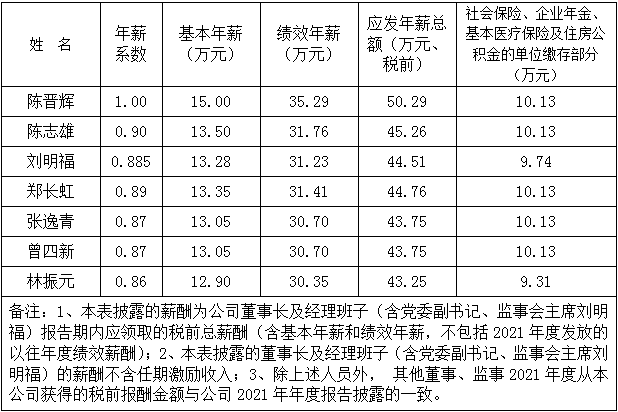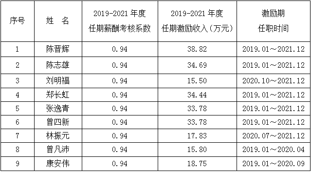 根據(jù)漳州市國(guó)資委及《公司董事長(zhǎng)、經(jīng)理班子年薪方案》的有關(guān)規(guī)定,同意公司董事長(zhǎng)及經(jīng)理班子人員(含黨委副書記、監(jiān)事會(huì)主席劉明福)2021年度薪酬方案修訂如下: