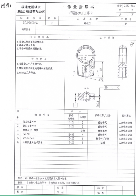 工藝試件為SI(L)A50ES(W).91桿端體,材料:45鋼,工序:銑鎖口。工藝要求見圖紙(附圖1)。