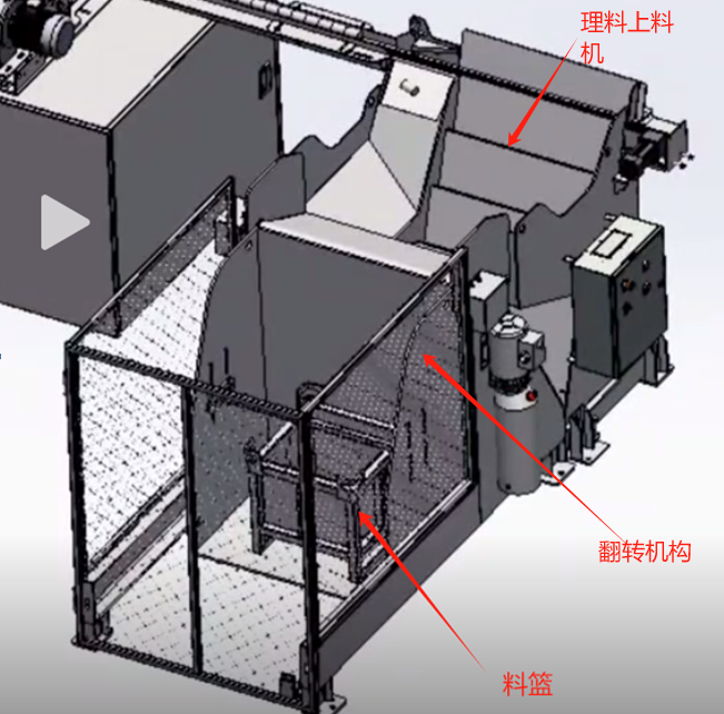 1.1上料:實(shí)現(xiàn)整籃上料,翻轉(zhuǎn)機(jī)構(gòu)將料籃翻轉(zhuǎn),物料間歇式倒入理料機(jī)(料籃翻轉(zhuǎn)角度可控),理料機(jī)自動(dòng)理料,有序送料至雙端面磨床進(jìn)料料道。