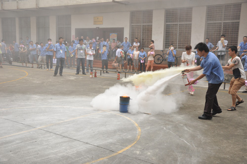 緊接著指揮人員讓參加演練的人員在一樓籃球場集中,闕教官現場講解和演示用干粉滅火器滅火的要領,并讓參演人員使用干粉滅火器進行現場滅火體驗。演練結束后,環境與安全管理部人員就本次演練活動進行了分析和小結