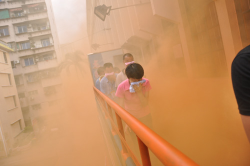 在闕教官講解相關消防知識和消防器材使用方法、傳授消防逃生應變技能和自我保護技能及明確各演練職能小組職責和演練小組疏散路線之后,演練開始。滅火行動組在得到演練命令后,立即發出火警訊號,并在各指定點放啟煙霧彈,樓梯道和走廊瞬間頓時濃煙滾滾。各演練組聽到逃生訊號后,在應急疏散隊的組織下,按組分批迅速有序地從俱樂部二樓往一樓籃球場疏散撤離,每人用濕毛巾捂住嘴巴,彎腰匍匐前進,按規定的順序疏散,直到沖出煙區。