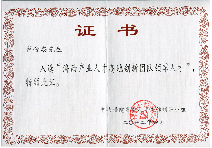 海西產(chǎn)業(yè)人才高地 創(chuàng)新團隊領軍人才(盧金忠)證