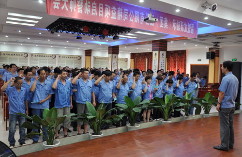 會上,陳晉輝常務副總首先宣布了《關于啟動精益項目管理的通知》,對項目范圍、目標、組織架構、項目小組人員和參與精益推進的相關各部門人員的職責做出明確規(guī)定,確保公司精益項目實施工作能夠按《精益項目計劃書(一期)》計劃內容順利進行,在2014上半年實現(xiàn)系統(tǒng)提績達標。企管部施毅群部長隨即就精益項目主體實施計劃與推進管理考核制度要點做了簡要講解。車間主管張高德、班組長張步斌分別代表公司中層主管和班組長發(fā)言,并帶領大家向公司董事長曾凡沛進行莊嚴的集體宣誓。協(xié)力中興董事長邱模榮也代表咨詢公司在會上發(fā)表了服務承諾。會議過程緊湊、氣氛莊嚴而又熱烈。